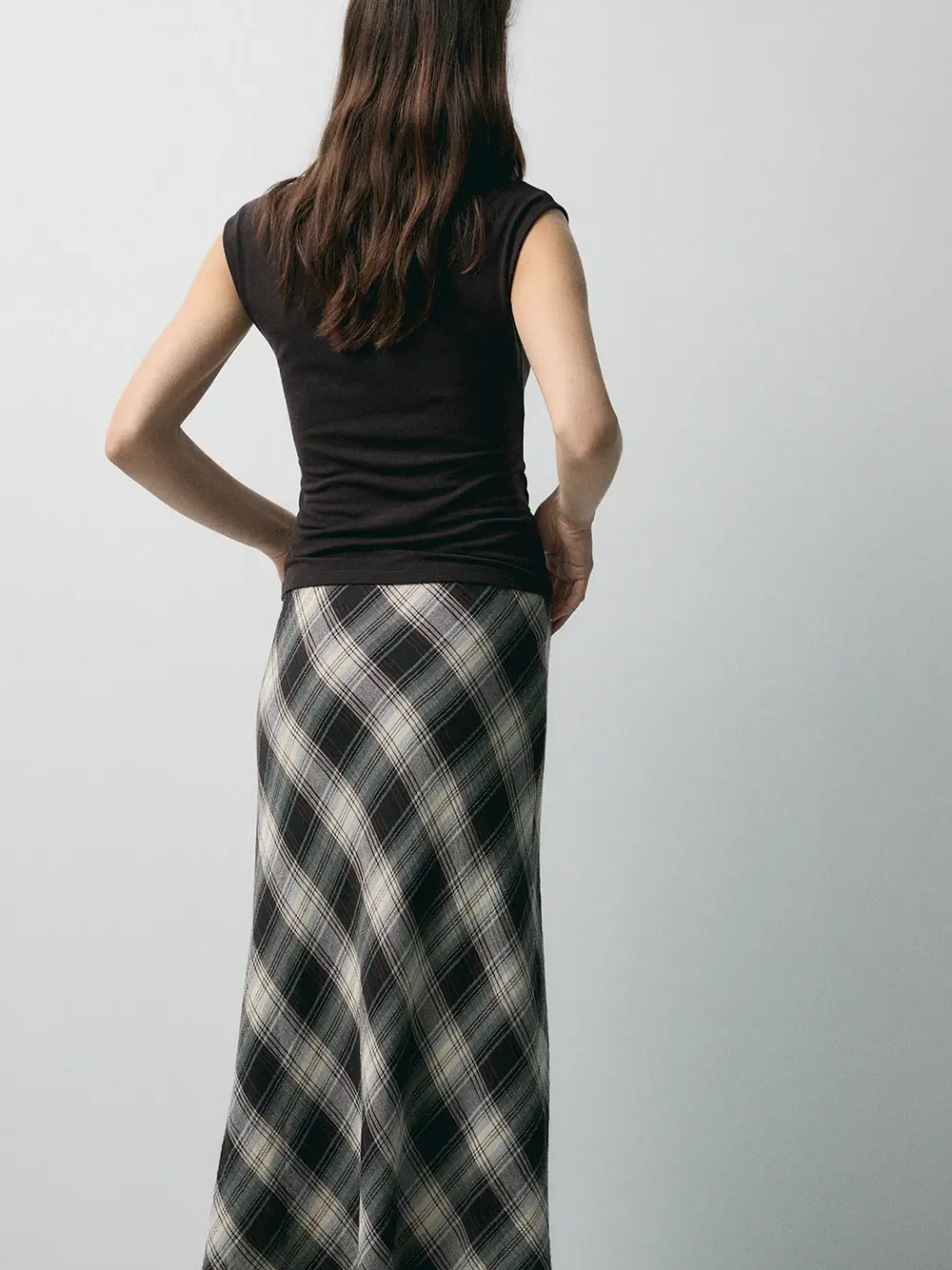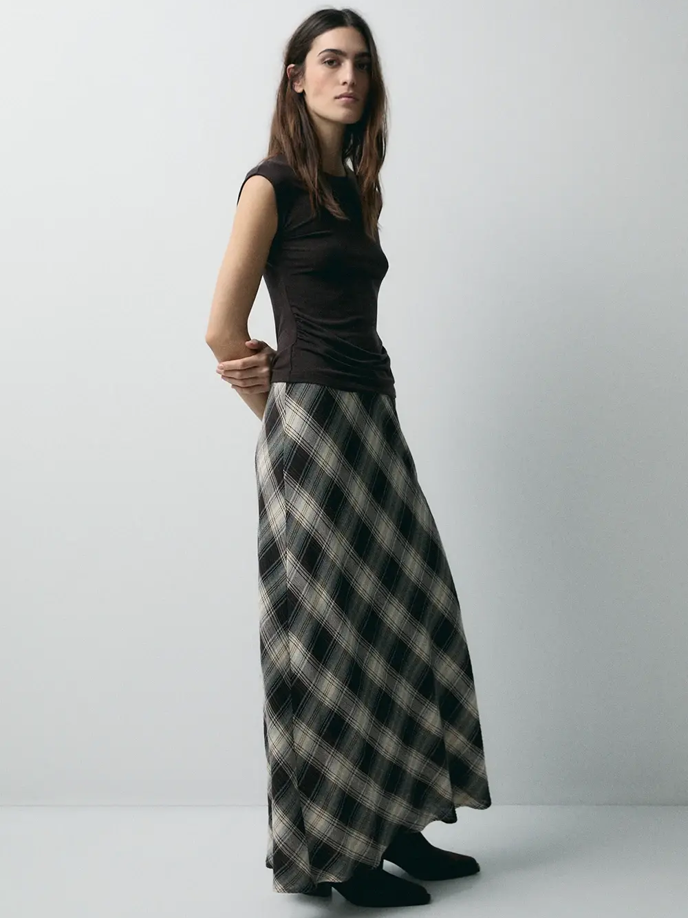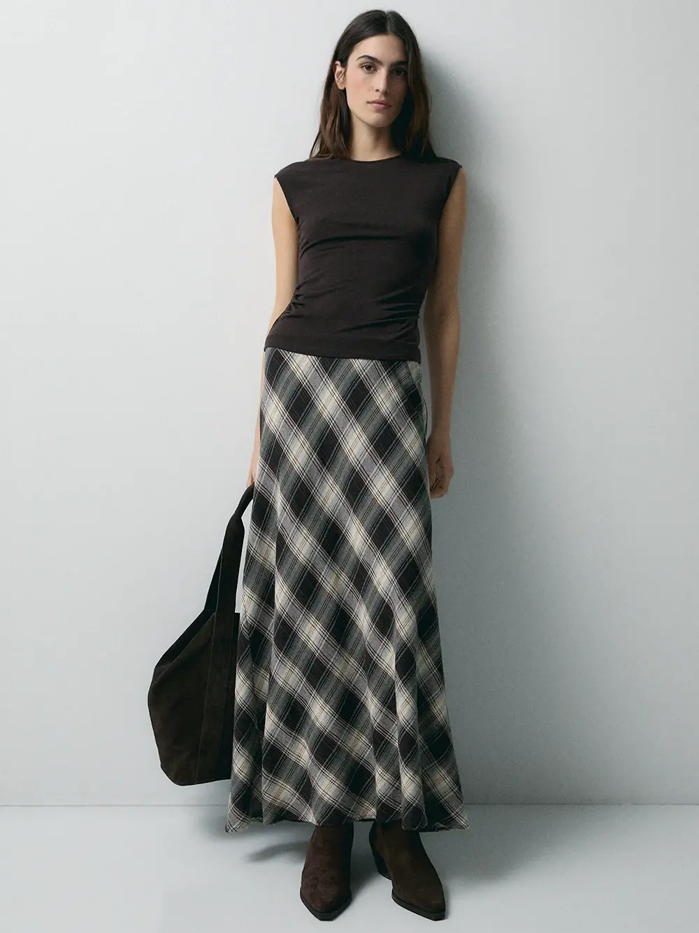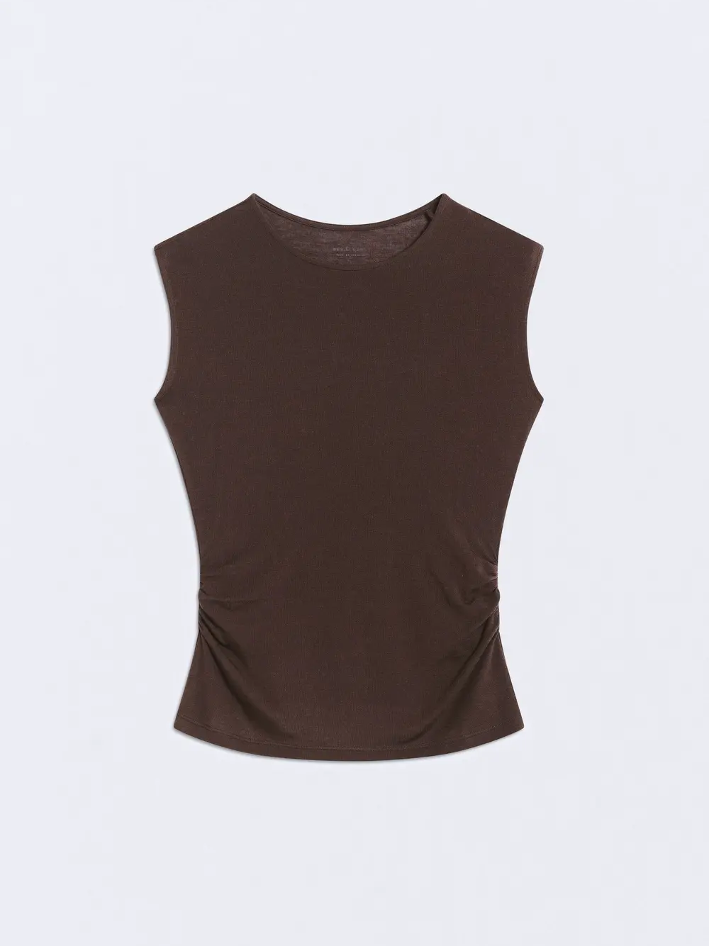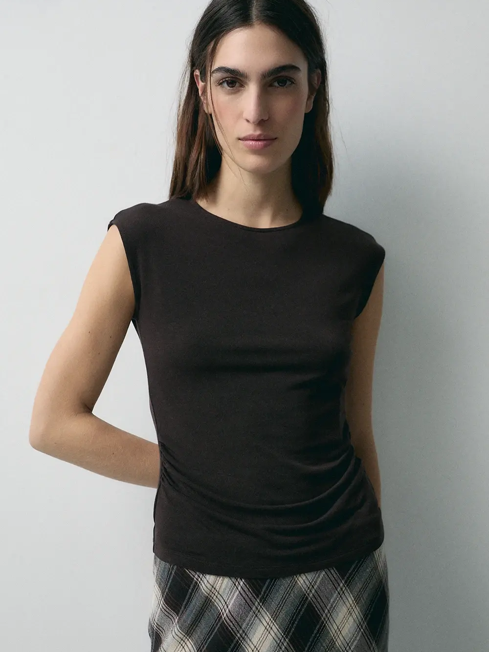 Camiseta de manga corta con fibras de lana. Fitting ajustado con detalles fruncidos en los laterales. Cuello redondo. En color chocolate. Largo prenda para talla S: 52 cm.