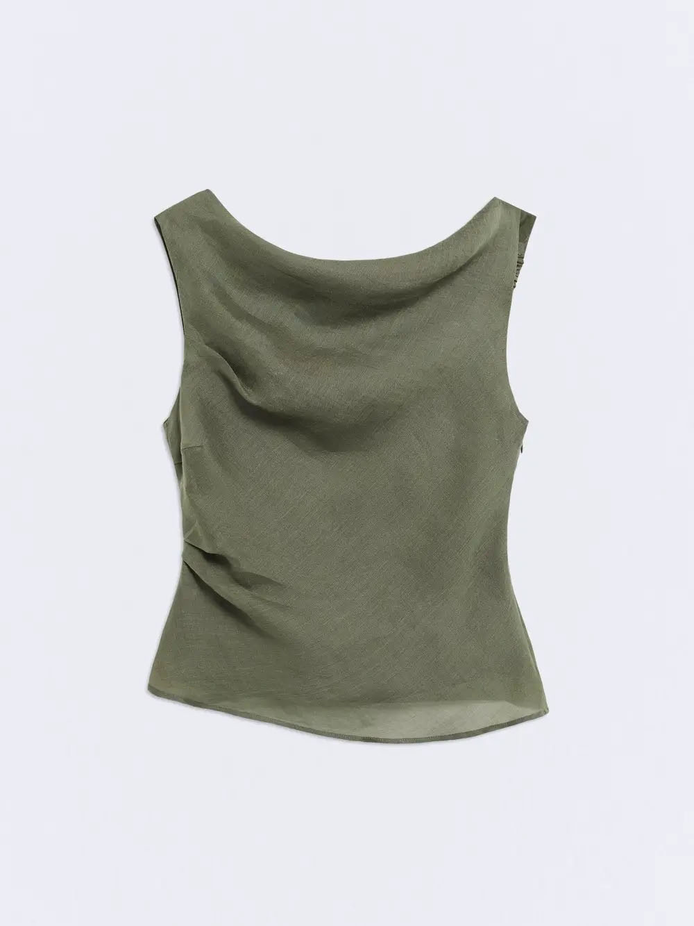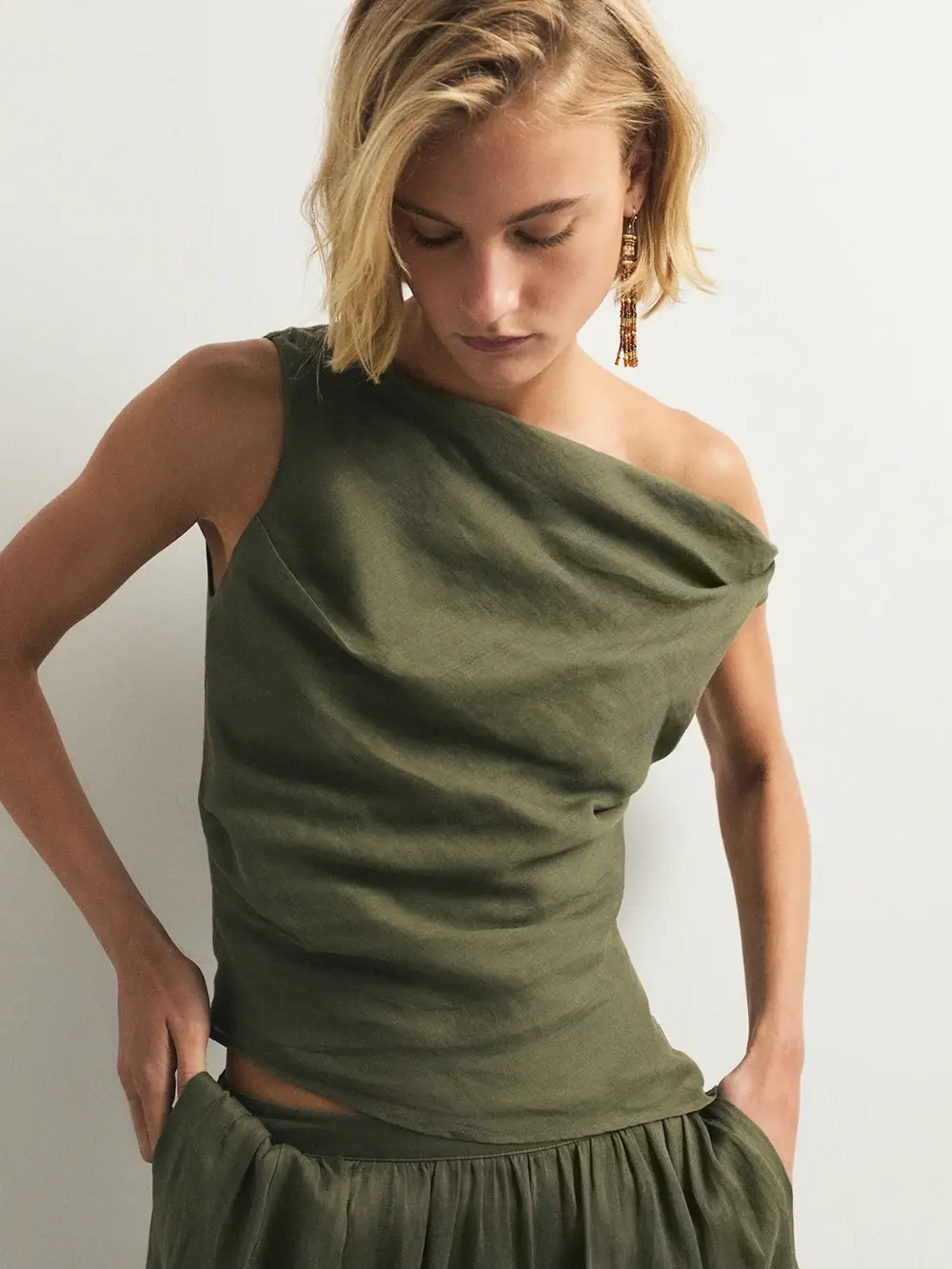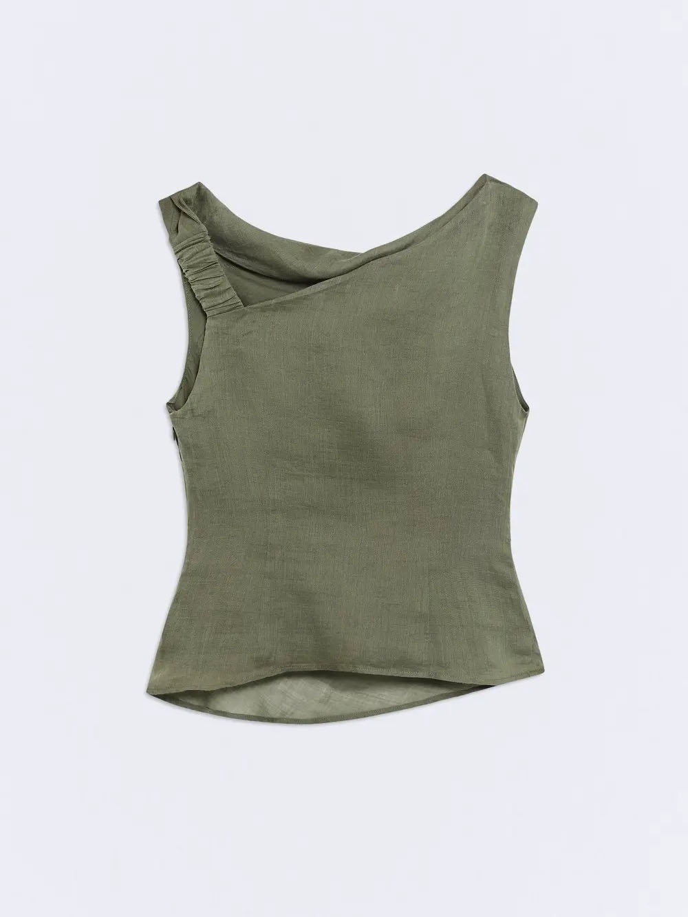 El top Creta es una prenda elegante y ligera confeccionada en 100% ramio, en color verde, con tejido natural que aporta frescura y comodidad.