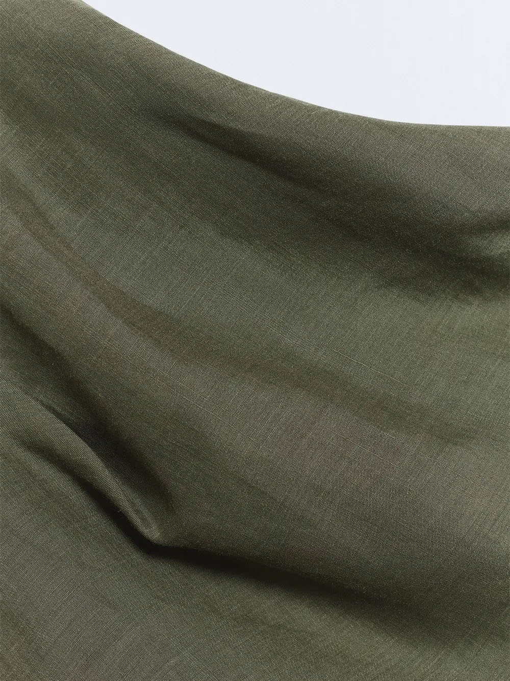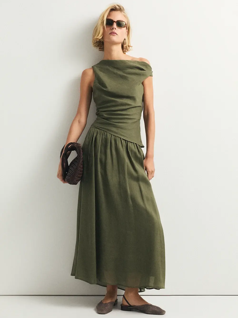 Diseñado sin mangas con tirantes asimétricos, presenta un drapeado que recorre todo el cuerpo, creando una silueta ligeramente ajustada y favorecedora.