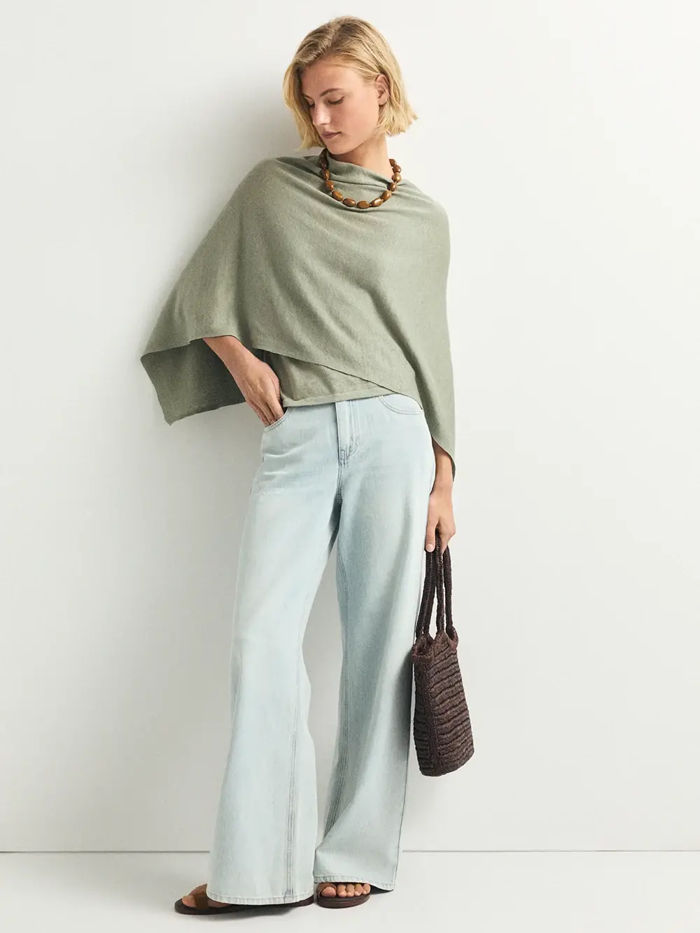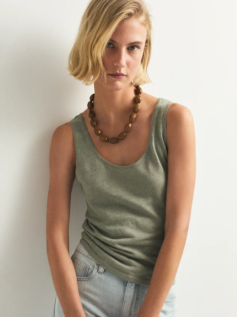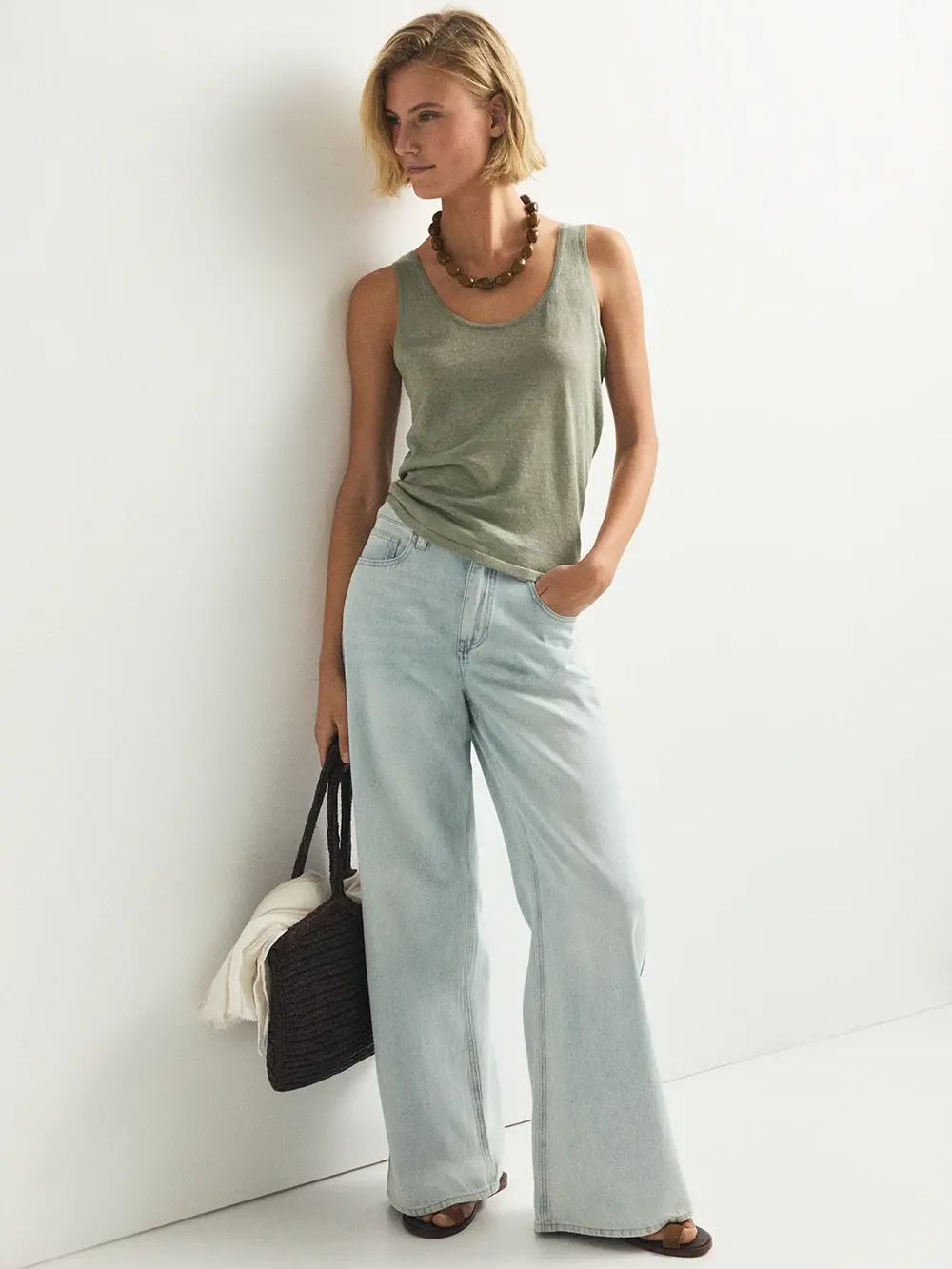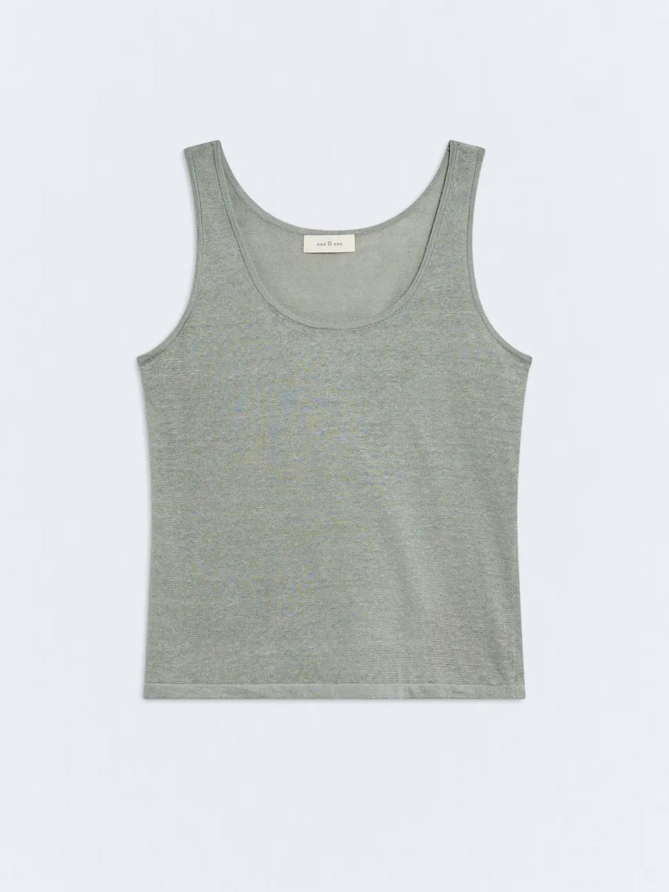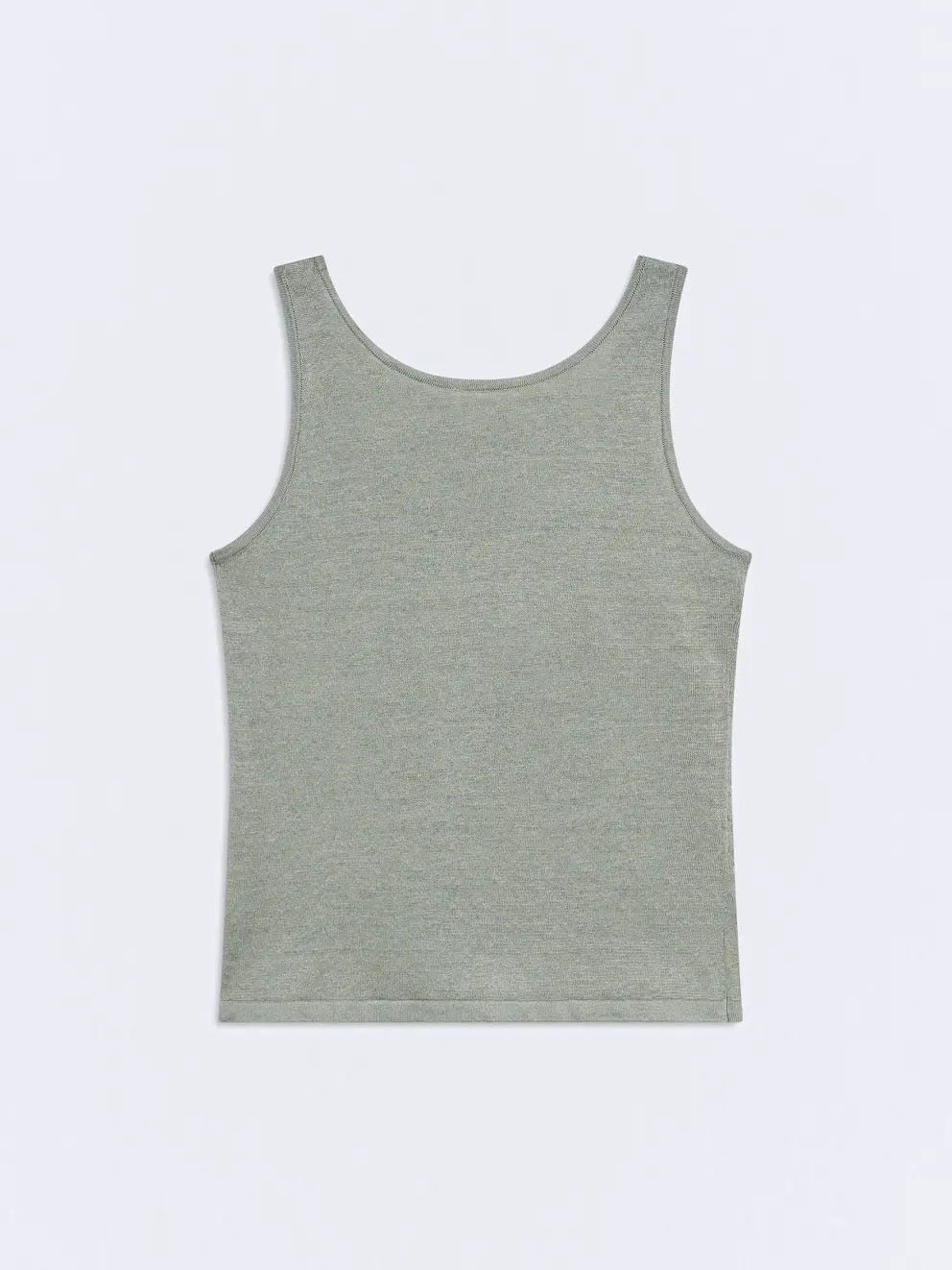 El top Nefora es una prenda ligera confeccionada en 100% lino de tejido fino (galga fina) en color verde agua.